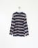 •네이비 & 그레이 스트라이프: 짙은 네이비와 그레이 가로 스트라이프를 기본으로 하며, 붉은색 가는 스트라이프가 실처럼 사이사이에 포인트 되어 있습니다. 라운드넥 디자인은 왼쪽 가슴 포켓과 조화로우며, 검정 바탕에 흰색 글씨 브랜드 로고가 은은하게 장식되어 있습니다.