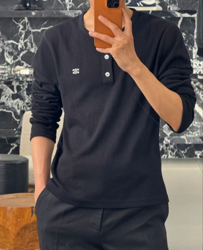 •파리 런웨이 착용 아이템, CELI** 신상 3버튼 하프 오픈 헨리넥 TRIOMPHE 자수 롱슬리브 티셔츠입니다. 2×2 립 코튼 소재로 단색임에도 단조롭지 않고, 살짝 신축성이 있어 착용 시 실루엣과 질감이 매우 뛰어납니다. 라운드넥에 3버튼 오픈, 클래식 헨리넥 디자인으로 소매와 밑단은 스트레이트 라인이라 스포티함과 빈티지 무드를 동시에 담았습니다. 가슴에는 상징적인 트리옴프(개선문 체인) 모티프의 미니 자수가 정교하고 볼륨감 있게 더해져 포인트가 되며, 높은 인지도를 담아냅니다. 유니섹스 디자인으로 다양한 스타일링에 쉽게 어울립니다. 고중량 워싱 2×2 립 원단을 사용해 ZP급 퀄리티를 구현했습니다.