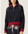 트랙수트에서 영감을 받아 파이핑 디테일이 장식된 이 지퍼 블루종 재킷은 고전적인 핀스트라이프 패턴을 젊고 현대적인 방식으로 재해석하여 비율, 색상 대비, 미*미* 옷장의 상징적인 요소를 활용했습니다.
